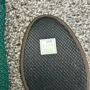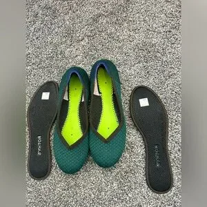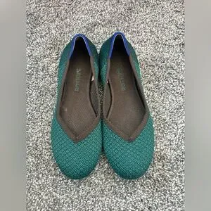 These are Rothy's The Flat in the limited edition color called Juniper. They are known for their textured green knit upper, brown trim, and a thin blue stripe accent along the top edge of the shoe. They are machine washable, designed for comfort with no break-in period required, and have a round toe.