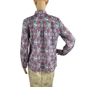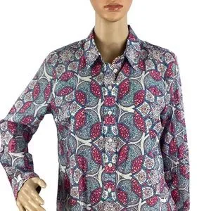 Tags: Talbots petite button down, blue pink medallion shirt, cotton long sleeve blouse, collared button front top, classic workwear shirt, preppy printed button down, breathable cotton office blouse, vibrant mosaic print top, colorful patterned dress shirt, everyday business casual top, spring summer cotton blouse