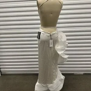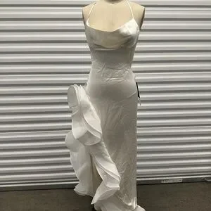 Introducing our Kailtin Dress, designed to steal the spotlight anywhere you go. Featuring a large slit and a dramatic ruffled hem, this gown exudes sophistication with a touch of modern flair. The open back adds a hint of allure, while the cowl neck drapes gracefully to frame the neckline with effortless grace. Whether you're walking down the aisle or attending a gala, this gown is guaranteed to make a statement. Shown here in White.