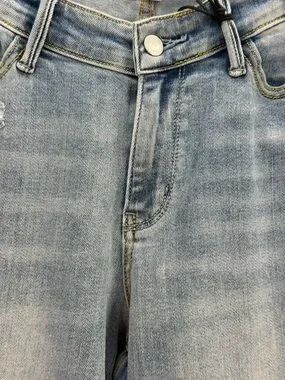 Crafted from high-quality stretch denim, they offer the ideal balance of structure and flexibility, making them perfect for all-day wear. The light vintage wash with subtle distressing gives them a trendy lived-in look that pairs effortlessly with sneakers, heels, or boots.
