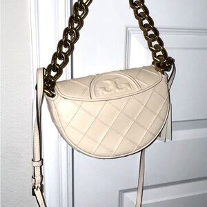 Tory Burch quilted leather crossbody in a soft cream tone. Features signature logo detail on front. Bold chunky gold-tone chain accent and adjustable leather strap. Sleek curved silhouette for polished looks.