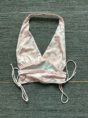 Light pink halter crop top with a small floral print. V-neck halter neckline. Ruched sides with adjustable ties. Feminine and lightweight.