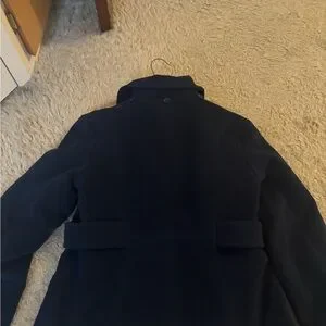 Structured pea coat with a tailored collar. Double-breasted front with large buttons. Flap pockets and button-tab cuffs. Polished, versatile outerwear for cool days.