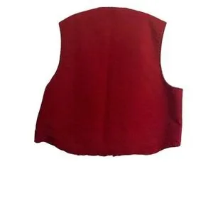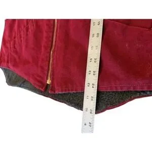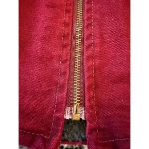 Carhartt vintage rare V13 CRI crimson red (discontinued, limited run color) duck canvas vest features a warm grey sherpa lining, perfect for layering in cold weather. This rugged workwear piece includes a full-zip front with a heavy-duty brass Carhartt-branded zipper and two front welt pockets for utility. The exterior is crafted from durable cotton duck fabric, while the interior provides plush insulation. A classic leather-like logo patch is prominently displayed on the left chest, maintaining the iconic Carhartt aesthetic. This item is vintage and rare, back when Carhartt used to be made in the USA. It is in immaculate condition and doesn't have an visible flaws.