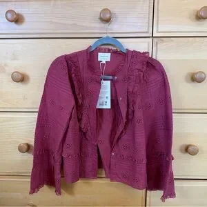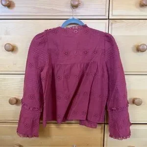 Beautiful romantic blouse in a deep rosewood pink / red with delicate ruffle + lace detailing. Lightweight organic cotton.