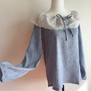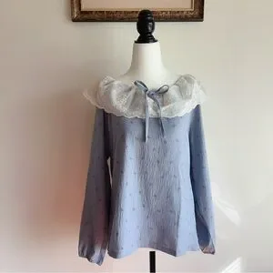 NEW! ✨Cozy Light Blue Bow Print Pajama Set w/ Large Statement Lace Collar