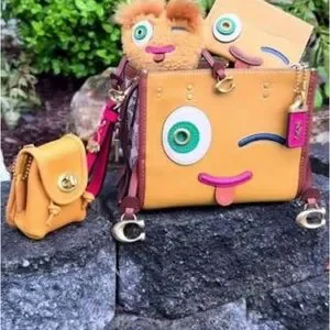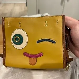 This brand new Coach mini bag from the playful Coachies collection is a fun, cheeky limited-edition piece featuring a bold winking emoji face with one large eye, a sly wink, and a protruding tongue – all appliquéd in contrasting leathers for maximum personality. Highly collectible and super cute for everyday pops of fun.