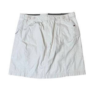 VINTAGE TOMMY HILFIGER women’s beige cargo mini skirt in size 6 with utility-style pockets and a classic neutral tone. Timeless early-2000s/Y2K style that pairs easily with tanks, tees, or oversized sweaters—great everyday piece with functional edge.