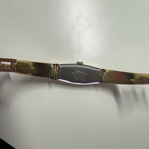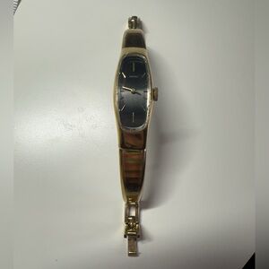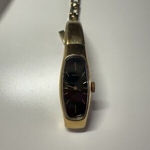 Slim Seiko ladies bracelet watch. Gold-tone case and linked band. Narrow black rectangular dial with gold markers and hands. Minimalist two-hand design. It's a lovely accessory fits for 6.5inch for any occasion! Sophisticated and streamlined style.