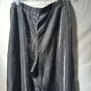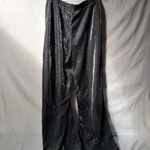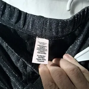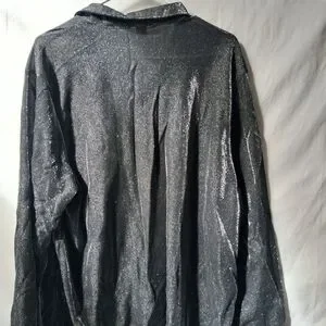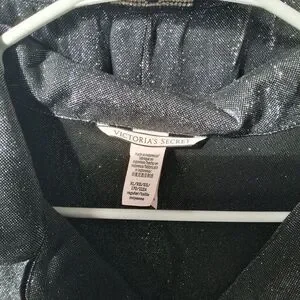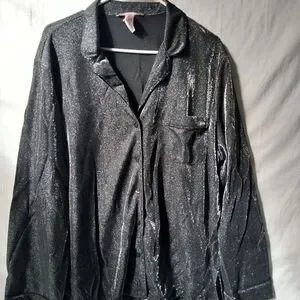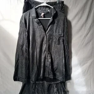 Black satin pajama top and bottoms with shimmering silver sparkle. Button-front style with relaxed collar. Lightweight sleepwear with subtle shine. Classic Victoria's Secret look. 29 in inseam