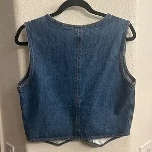 Sleeveless denim vest with button-front closure. V-neck styling and subtle paneling for shape. Two front welt pockets with contrast stitching. Casual, easy-to-layer wardrobe piece.