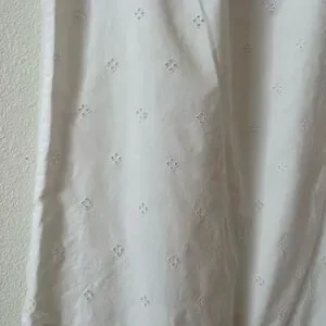 All-over embroidered eyelets, with ladder-lace trim at the scalloped border hem.