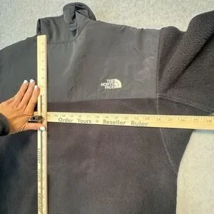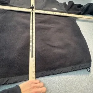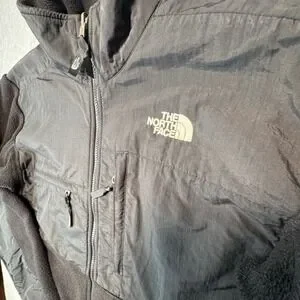 The North Face Denali Polartec fleece jacket features a classic two-tone black design with durable nylon overlays on the chest, shoulders, and elbows. This mid-weight layer includes a full-zip front, multiple secure-zip pockets for storage, and pit zips for ventilation. The hem is adjustable with a cinch-cord to lock in warmth, while the elastic cuffs ensure a snug fit. All zippers are fully functional, and the garment is free of holes, rips, or tears.