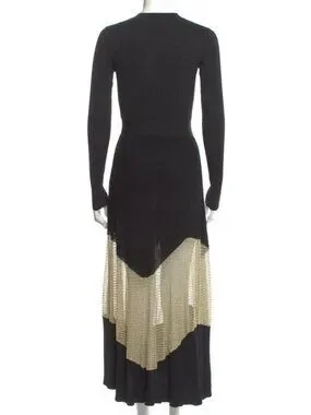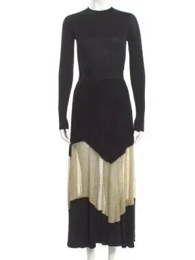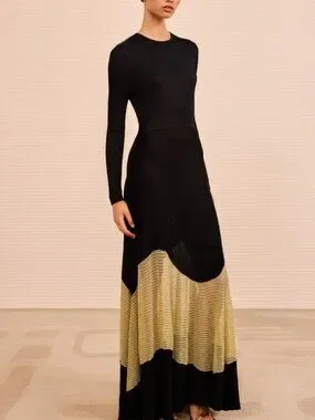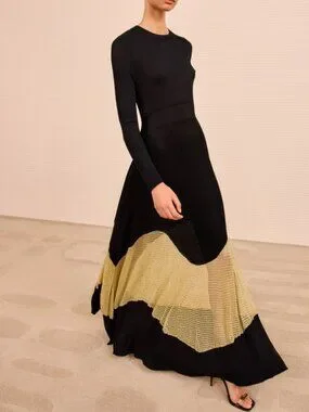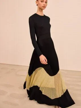 A study in shadow and light, the Roanne Knit Maxi Dress in Gold Noir by Ulla Johnson glows like midnight touched by fire—its inky black ribbed knit tracing the body with quiet precision, while threads of molten gold flicker through the hem like embers refusing to fade. There is a subtle seduction in its contrasts: opacity dissolving into sheer, structure softened by movement, strength tempered with radiance. The silhouette falls long and fluid, skimming rather than clinging, as if it understands the art of restraint. Each step reveals a glint, a whisper of brilliance beneath the darkness—this is not simply a dress, but a slow revelation, unfolding in light with every motion.
