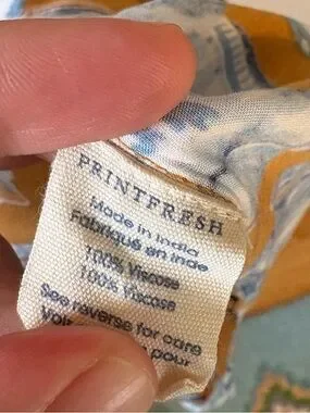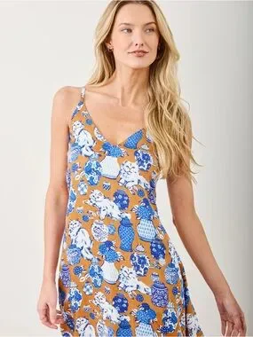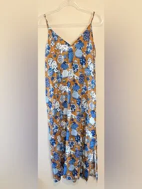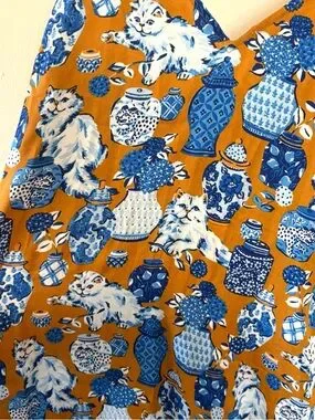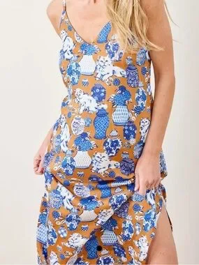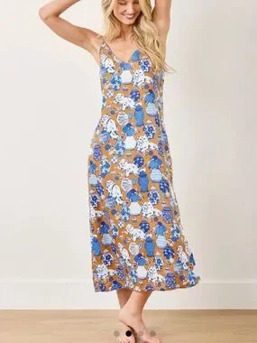 Printfresh chic to sleep nightgown in tobacco fancy cat print. 100% eco-friendly viscose that's thermoregulating, breathable and cool. Soft & lightweight fabric drapes beautifully. Designed to graze the body without being too form-fitting. Features adjustable straps and smocked back detailing for a customized fit. Midi length measures 45.5" long from the v-neck to the bottom, with a 17" side slit for easy movement. No pockets. Fun whimsical cat print. In excellent condition. Size small.