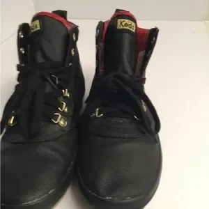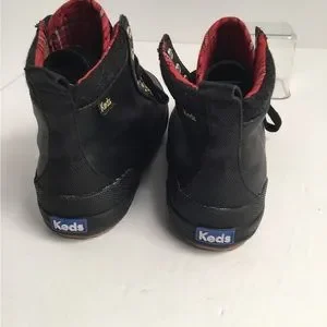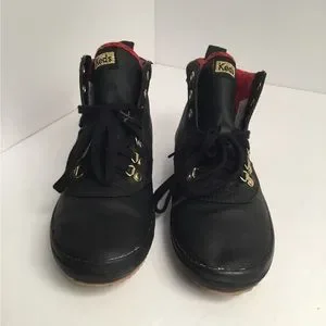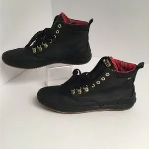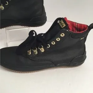 Stylish Keds high-top lace-up boots. Black textured upper with gold-tone eyelets. Red plaid interior lining. Rubber sole for traction. Versatile casual look.