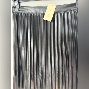NEW WITH TAGS Elegant pleated faux leather midi skirt in black. Soft, shiny finish with structured pleats for a polished silhouette. Versatile black skirt that pairs easily with tops for day or night. Comfortable waistband and smooth drape with side zipper closure.