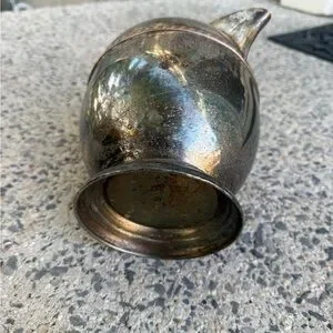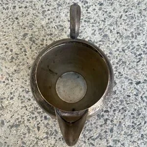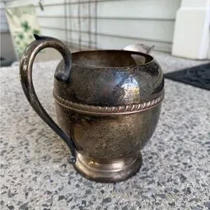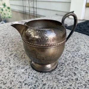 Antique silver-plate and copper pitcher with elegant rope-band detail around the body. Features a classic curved handle and spouted design. Beautiful vintage patina throughout, adding character and charm—perfect for farmhouse, cottage, or traditional decor.