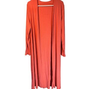 Rust Orange Ribbed Knit Open Front Duster Cardigan Long Sleeve Midi Length Women