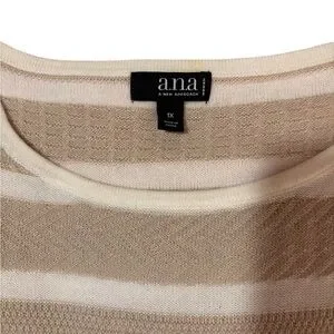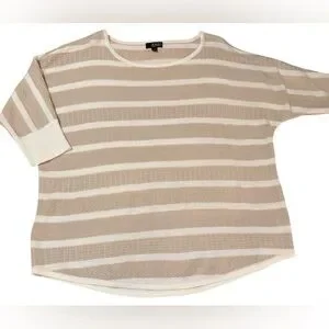 Stylish sweater with beige and cream stripes. Very soft. Ideal for everyday comfort. Gently used - no visible snags. Some very minor pilling.