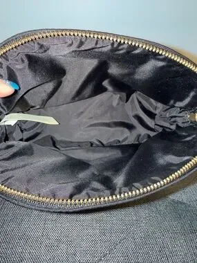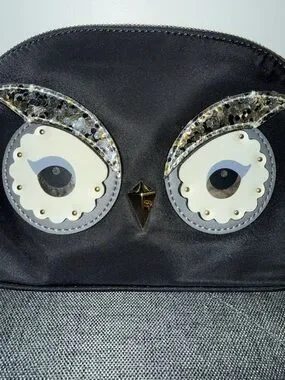 Chic black cosmetic pouch with playful owl appliqué. Features sparkling gold and cream eye accents for a fun, fashionable look. Lightweight and easy to carry for everyday use. Adds a whimsical touch to your essentials.