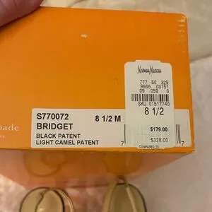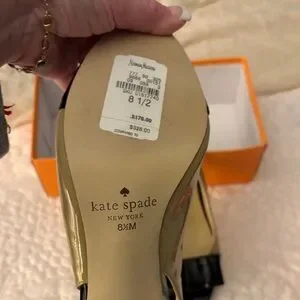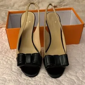 Chic peep-toe slingback mules by kate spade. Beige leather upper with glossy black patent bow and toe. Open back sling design for easy wear. Sophisticated two-tone look for dresses or polished outfits. Never wore them , ever .