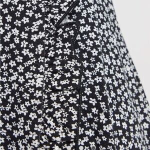 Darling mini dress with a deep V-neck. Short ruffle sleeves and a slight ruffle hem. Fitted at the waist with a gentle A-line skirt. Subtle white floral pattern throughout. Fun and Flirty