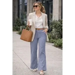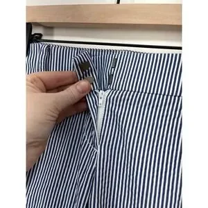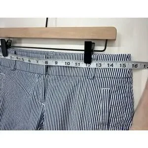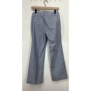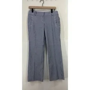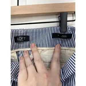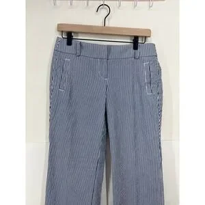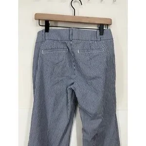 This is a pair of loft, Searsucker blue and white pins striped pants women's size 0 petite they do have a zipper and clasp fly two front side pockets. They have a fitted look in the hips and they come out farther in the bottom of the legs these do have back trouser pockets and belt loops. They are gently used smoke free pet friendly home. I do not see any stains or holes overall great condition. Measurements are in photos. Sold as is.
