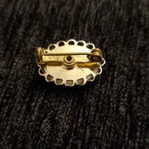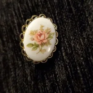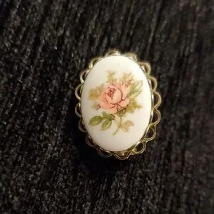 Vintage unsigned Milk Glass cameo featuring a hand-painted pink rose motif. Gold-tone scalloped setting Subtle pink and green accents add feminine charm. Perfect condition and comes in a jewelry gift box