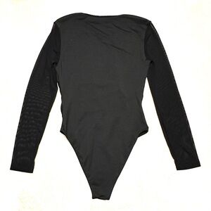 Black long-sleeve bodysuit with sheer mesh panel details on front and totally sheer sleeves.