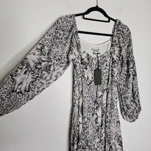 Step into sophistication with this New With Tags (NWT) All Saints Women’s Gray Patterned Dress in a chic Size 2. This dress is the epitome of modern elegance.