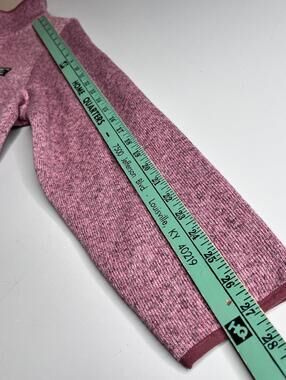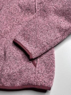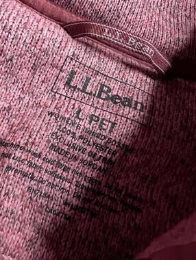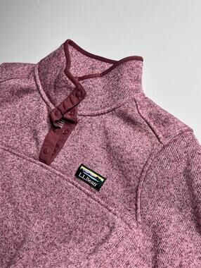 Pre-owned L.L.Bean fleece sweatshirt with light wear from prior use. Heathered pink fabric and trim are clean and intact without stains, holes, or discoloration. Interior fleece, tagless neck print, and chest logo patch are crisp. Snap placket, seams, and front pockets are secure and fully functional.