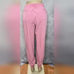 Soft pink jogger-style scrub pants for kids. Elastic waistband with bright drawstring. Side cargo pocket and zippered pockets. Ribbed cuffs for a snug fit. Lightweight, durable fabric for daily wear.