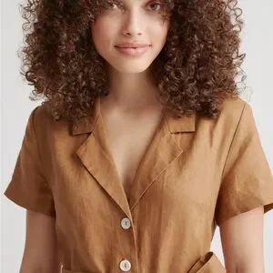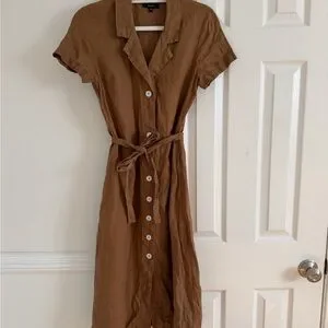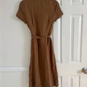 Quince 100% European Linen Button Front Dress Brown Tan Tie XS