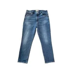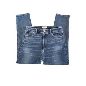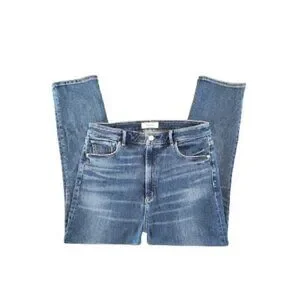 Medium rinse stonewashed skinny ankle jeans. High-waisted. Single button and zipper front closure. Distressed detail on the hem and pocket trim. Whiskering accents. Sanded detail. Five pockets.
