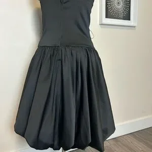Strapless satin dress by le chateau. Sleek fitted bodice with smooth finish. Full bubble skirt drapes elegantly. Simple, refined silhouette for evening wear.