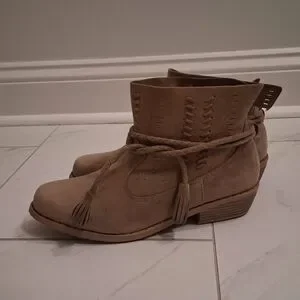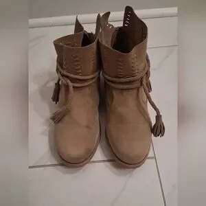 Comfortable taupe suede ankle booties with braided tassel wrap. Soft suede upper with decorative cutouts for a stylish finish. Low stacked heel offers everyday comfort and easy pairing with casual looks.
