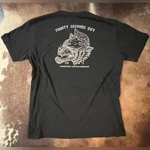 Classic black crewneck tee with a bold '30 sec out' graphic. Comfortable cotton blend and relaxed fit. Features a multicolor red, blue, and white graphic for casual everyday wear.