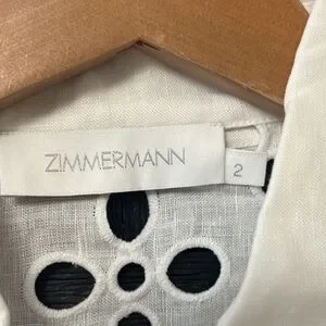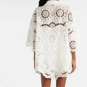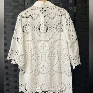 White tunic with embroidered eyelet cutouts. Collared neckline with V-slit. Three-quarter flowy sleeves and scalloped trim. Delicate, airy layering piece. Size 2 USA 6-8