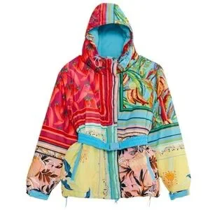 Farm Rio- NWT Multicolored Hooded Mix Scarves Printed Puffer Belted Ski Jacket
