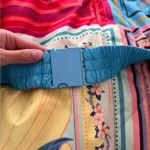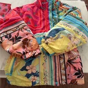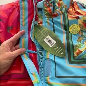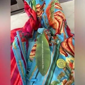 Never worn with tags. Stunning puffer jacket from designer, Farm Rio. Mixed print and bright color patches print. Hooded with option snap belt. Super soft and comfortable