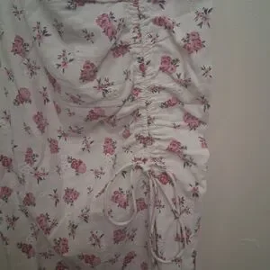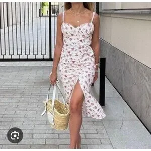 Zara Cottage Pink Floral Dress Eyelet Front Slit Sweetheart Neck