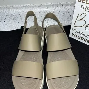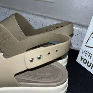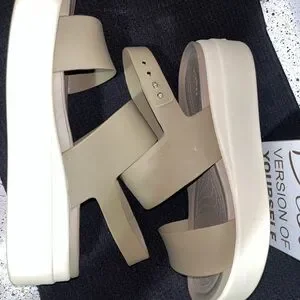 Platform sandal with wide olive straps. Cushioned footbed for comfort. Adjustable backstrap for secure fit. Lightweight foam platform adds height. Easy slip-on style for daily wear.