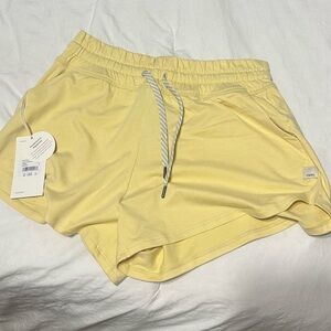 Light yellow Vuori athletic shorts. Elastic waistband with drawstring. Soft, breathable knit fabric. Side pockets for essentials. Relaxed fit for workouts or leisure.