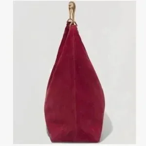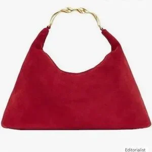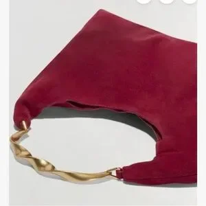 Sleek red suede shoulder bag with a sculpted gold-tone handle for a polished look. Soft suede exterior and a refined crescent silhouette. Designed for effortless style from day to evening. Comfortable to carry and pairs easily with wardrobe staples.