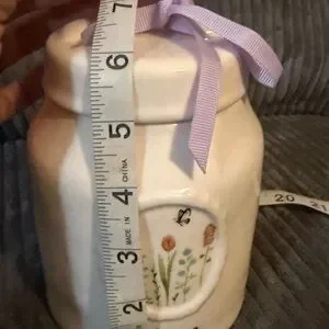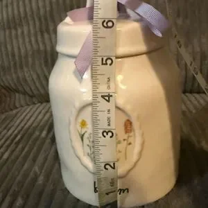 The Rae Dunn White Ceramic Jar with a Floral Pattern is a charming farmhouse-style cookie jar perfect for storing your favorite snacks or treats. This one qt jar features a lovely white color with a beautiful floral pattern, adding a touch of elegance to your kitchen decor. Made from ceramic, this jar includes a lid for secure storage and measures 7 inches in height.