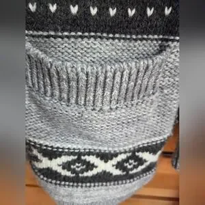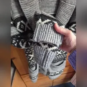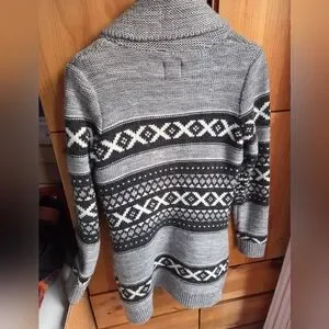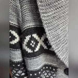 Details like the collared neckline and handy pockets add a touch of sophistication to this grey and black cardigan. The geometric pattern gives it a modern edge, making it a versatile piece for your wardrobe. Machine washable for easy care, this cardigan is as practical as it is fashionable. In excellent used condition.