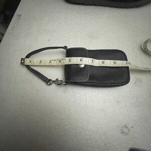 Genuine Coach pebbled leather phone case. Top flap with snap closure and logo hardware. Single strap for crossbody or wrist carry. Slim profile with classic stitching details.