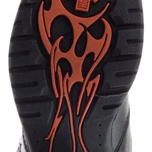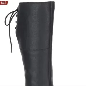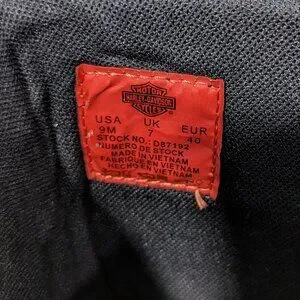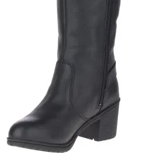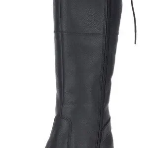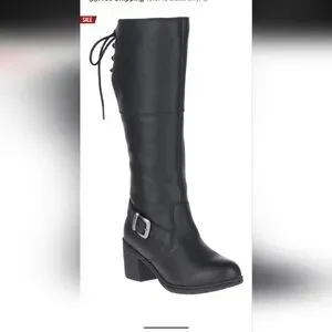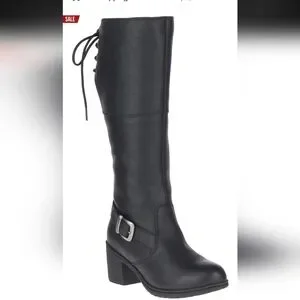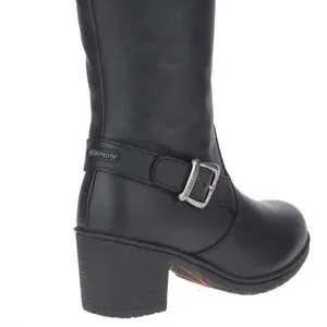 Authentic Harley-Davidson knee-high boots. Lace-up back detail with buckle accent. Chunky stacked heel for stable wear. Smooth black upper with subtle grain. Versatile biker style for many outfits.