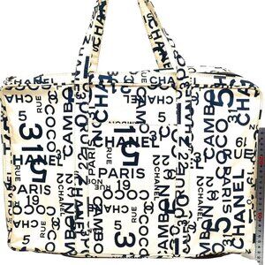Authentic CHANEL Rue Cambon Travel Bag Vintage White & Navy Canvas